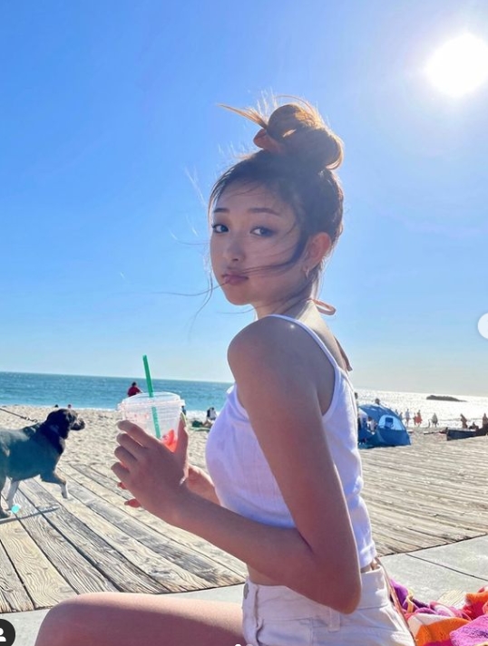 공개된 사진 속 변정수의 둘째딸은 해변에서 음료수를 마시고 있다.