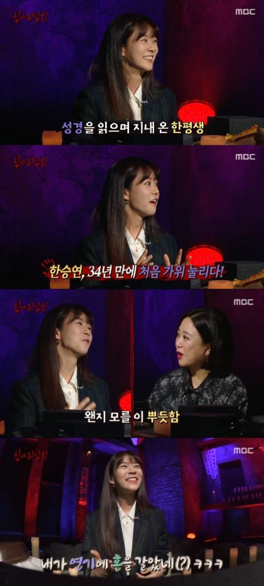 이날 한승연은 "작년에 공포물 2편을 촬영했다"면서 괴담에 큰 관심을 드러냈다. 촬영을 하며 생애 첫 가위를 눌려봤다는 그는 "20년 동안 매일 성경을 읽는 사람이다. 내가 연기에 혼을 갈았네 생각했다"고 긍정적인 마인드를 드러냈다.