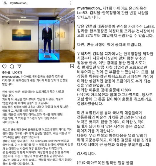 ​최근 역사 왜곡과 동북 공정으로 인해 문화 유산의 중요성이 더욱 부각되는 시기에 악성 개인 팬들이 디자이너의 경매 의도를 왜곡하고 괴롭힌 것이 알려져 충격을 주고 있다. ​경매취소 반대 및 재개 의견이 빗발치자 김리을 디자이너는 SNS를 통해 ‘먼저 경매를 취소하게 되어 진심으로 사과의 말씀을 드립니다. 2주 동안 정말 너무 힘들었습니다. 또 다른 작품으로 찾아 뵙겠습니다’라며 그간의 마음 고생이 극도로 심했음을 알려 팬들을 안타깝게 했다.