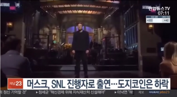 머스크는 가상화폐 도지코인(Dogecoin)을 지지하는 트윗을 지속적으로 트위터에 투고해 왔다. 프로그램 오프닝 토크에서는 모친인 마이에 머스크가 “어머니 날 선물이 도지코인은 아니면 좋겠은데”라고 물었고, 머스크는 “도지코인이야”라고 답했다. 또, 프로그램 중 뉴스 코너에서 캐스터는 “도지코인은 도박(hustle)이죠?”라는 질문에 대해서 머스크는 “그렇다”고 답했다. 이 때부터 도지코인의 가격은 급락했다.