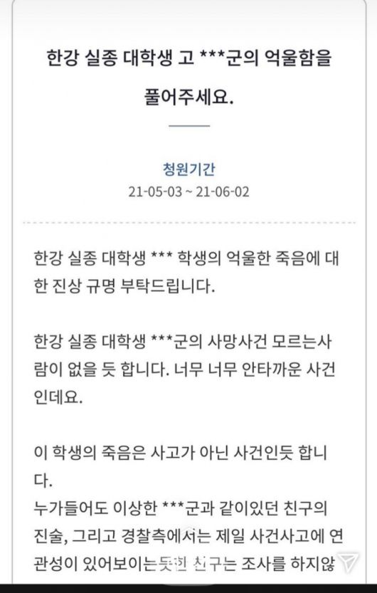 청원인은 "한강 실종 대학생의 억울한 죽음에 대한 진상 규명을 부탁드린다"라며 "너무 안타까운 사건. 이 학생의 죽음은 사고가 아닌 사건인 것 같다"라고 했다.