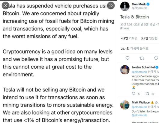 머스크는 테슬라가 보유 중인 비트코인을 팔지 않을 것이라고 덧붙였다. 비트코인 채굴 작업이 보다 지속가능한 에너지를 투입하는 형태로 전환되면 비트코인 결제를 다시 허용할 계획이라고 강조했다.