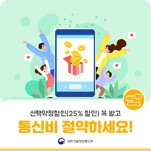 과학기술정보통신부는 SK텔레콤·KT·LG유플러스 등 이동통신 3사, 한국통신사업자연합회(KTOA)와 함께 휴대폰 선택약정 25%할인에 대한 홍보와 안내를 강화한다고 17일 밝혔다.