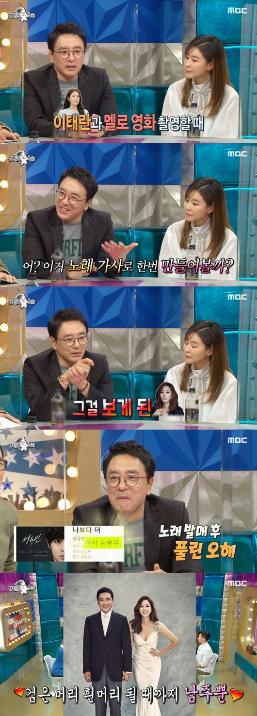 이날 김승우는 이태란과 멜로 영화를 촬영할 때 김남주에게 오해를 산 에피소드를 공개했다. 그는 "대본을 보고 영감을 받아 작시를 해봤다. 다 쓴 걸 보고 재미있겠다 싶더라. 그걸 화장실에 놓고 잤는데, 아침에 아내가 본 거다"라며 "오해받기 딱 좋은 내용이었다"라고 말했다.
