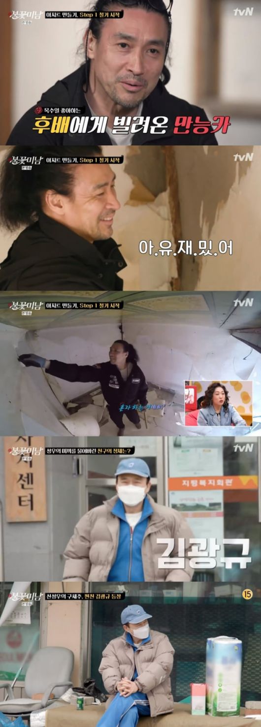 이어 신성우는 절친한 배우 김광규를 일꾼으로 초대해 모두를 놀라게 했다. 친구와 아지트를 함께 꾸미는 로망이 있었다고. 신성우는 "말만 투덜이다. 하면 열심히 하는 친구다"라며 김광규를 소개했다.