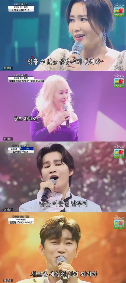 이후 김희재는 '잃어버린 우산'을 선곡해 뛰어난 가창력을 선보였고 정동원 역시 '송인'을 열창하며 나이를 잊게하는 압도적인 실력을 보였다. 특히 임영웅은 뮤지컬 '데스노트'를 선곡했는데 '데스노트'에 출연한 적이 있는 정선아는 "저거 어려운 노래다"라고 말해 기대감을 자아냈다.