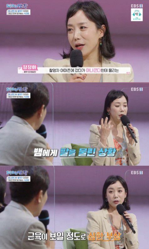 개그우먼, 배우, 쇼호스트로 활동해온 정정아는 지난 2005년 KBS '도전! 지구탐험대' 촬영 도중 아나콘다에 팔을 물리는 초유의 피해를 입었다. 이때문에 방송계는 발칵 뒤집어졌고 프로그램은 폐지됐다. 정정아는 다행히 상처를 회복했지만 이 사건으로 받은 충격과 상처는 생각보다 컸다.