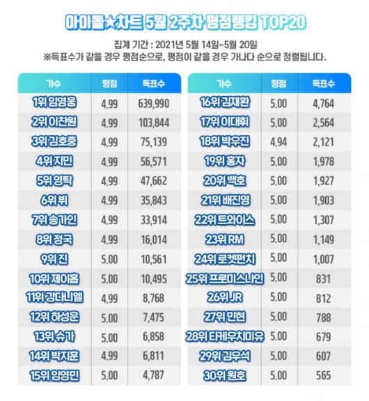 아이돌차트에 따르면 5월 14일부터 5월 20일까지 집계된 평점랭킹에서 임영웅은 63만 9990표를 얻어 최다득표를 기록했다.