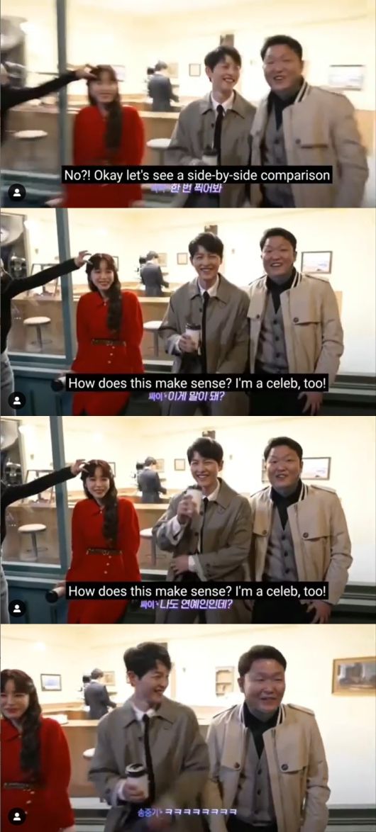 이를 들은 싸이는 송중기의 옆에 서서 “한번 찍어봐라. 이게 말이 되냐. 나도 연예인인데. 왜 이렇게 작은 거냐”고 타박한 뒤 황급히 자리를 떴다.
