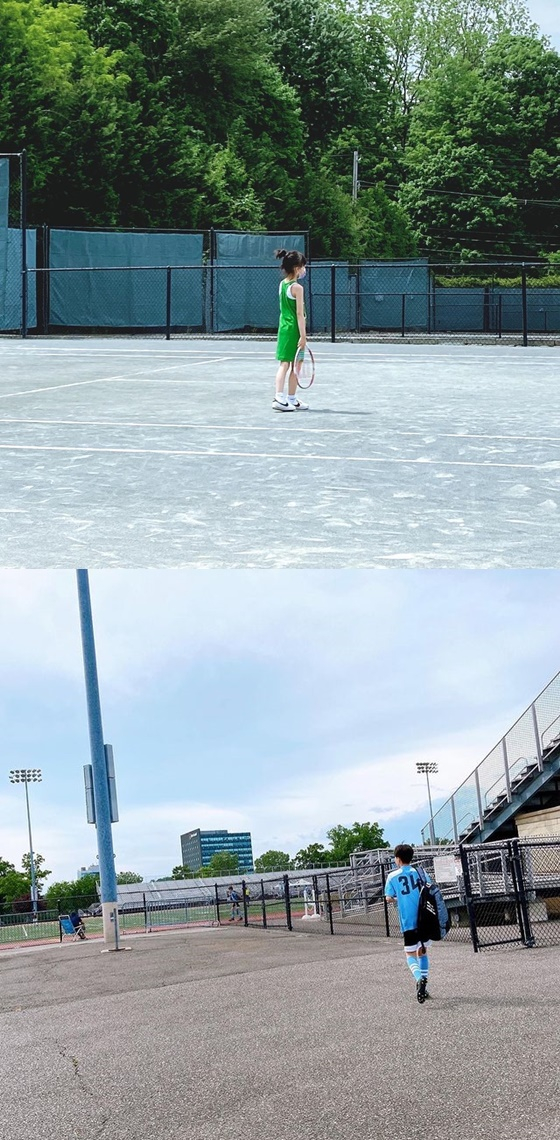딸 리호는 테니스를 치기 위해 나섰다. 초록핵 원피스를 입은 리호는 엄마를 닮아 길쭉길쭉한 비율로 눈길을 끌었다.