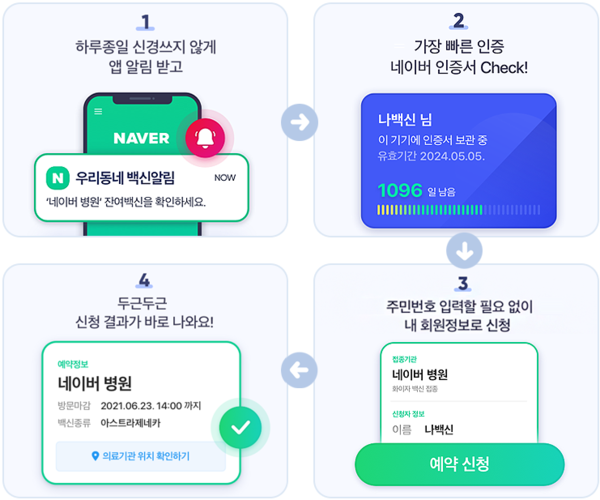 네이버 앱 및 카카오톡을 통한 알림 예약은, 알림 신청 시 인증을 우선 진행하므로, 알림 수신 후 추가 인증 없이 당일예약이 가능합니다.