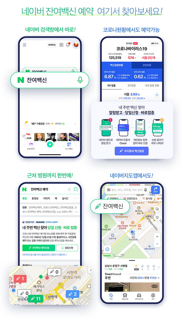 네이버의 경우, 네이버앱이나 네이버지도앱 또는 스마트폰의 인터넷 브라우저에서 네이버에 접속해 검색 창에 “잔여백신”으로 검색하면 잔여백신 조회가 가능하며,
