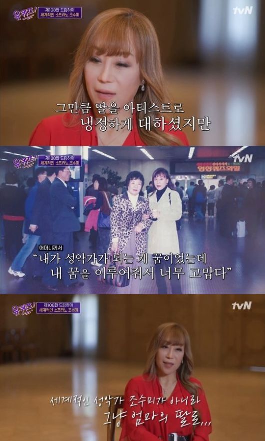 이날 조수미는 “어머니에 대한 특별한 사랑과 미움이 있다. 미움은 너무 어렸을 때부터 저를 피아노, 웅변, 미술, 가야금, 발레, 피겨 스케이트 등 온갖 걸 다 시키신 것이다. 공부도 항상 1등을 해야 했다. 바쁜 어린이였는데 그게 늘 행복하지는 않았다”라고 운을 뗐다.