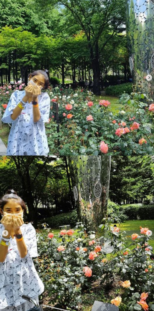 윤주는 28일 자신의 SNS에 “기분좋은 산책 ! 이곳의 명물 장미꽃이 만개함ㅋㅋ 작은엄마랑 추억만들기♡ 이쁘다아ㅋ 이젠 나도 꽃이랑두 사진찍는군아ㅜ #장미 #서울아산병원 #추억 #이뿐척 #으으”라는 메시지를 적었다.