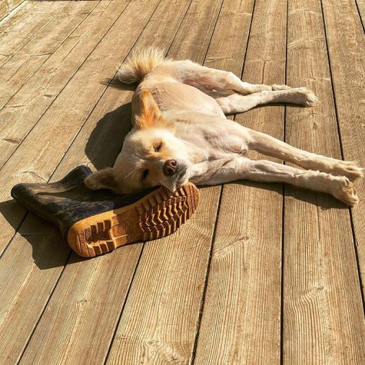 사진의 내용은 강아지 한 마리가 장화를 베고 곤히 잠든 모습. 고실이는 이효리, 이상순 부부가 키우는 반려견으로 귀여운 모습으로 사람들의 시선을 사로잡았다.