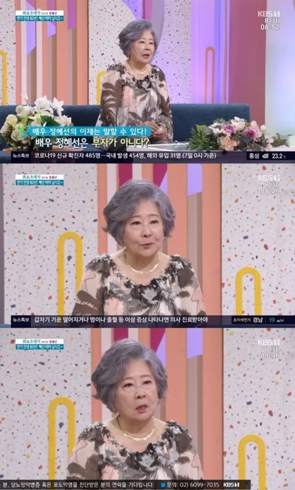 8일 방송된 KBS ‘아침마당’에는 정혜선이 ‘화요초대석’ 게스트로 출연, 연기 인생 60년을 돌아봤다.
