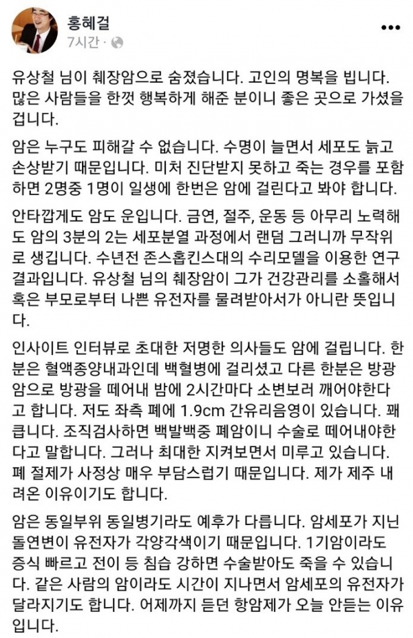 홍혜걸은 오늘(8일) 자신의 SNS에 “유상철님이 췌장암으로 숨졌다. 고인의 명복을 빈다. 많은 사람들을 한껏 행복하게 해준 분이니 좋은 곳으로 가셨을 것"이라면서 "암은 누구도 피해갈 수 없다"고 말했습니다. 그는 “미처 진단 받지 못하고 죽는 경우를 포함하면 2명 중 1명은 일생에 한번은 암에 걸린다고 봐야한다"고 말했습니다.