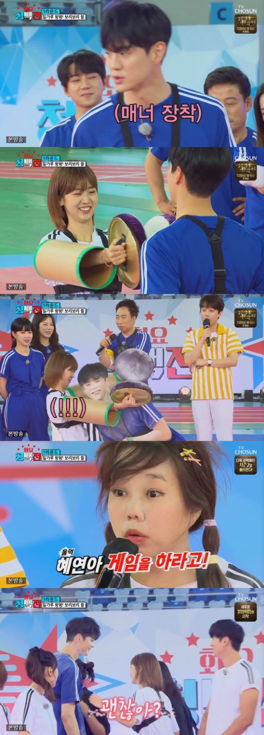 이날 '밀가루 팡팡, 보리보리 쌀' 게임을 진행했다. 밀가루가 묻은 장갑을 끼고 상대 선수가 '쌀'을 외칠 때 얼굴을 때리는 게임이었다.