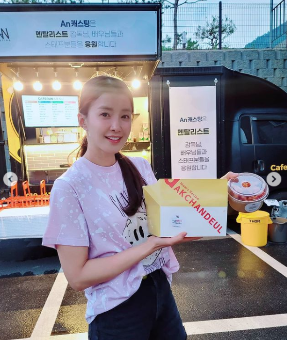 11일인 오늘 새벽, 이시영이 개인 인스타그램 계정을 통해서 "오늘우리 세트장에 #커피차 와 #닭찬들"이라면서 "너무 맛있는 닭강정때문에 다이어트는 망했지만 너무 잘먹었어요!"라며 간식차를 받으며 행복한 미소를 짓고 있다.