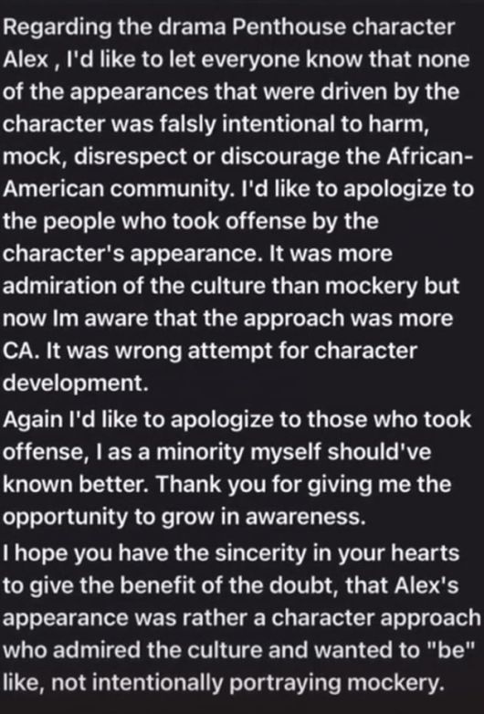박은석은 12일 자신의 SNS 계정에 영문으로 글을 게재했다. 게재된 글 내용에는 "드라마 '펜트하우스' 속 캐릭터 알렉스의 외모와 관련해 아프리카계 미국인 사회에 해를 끼치거나 조롱하거나, 무례하게 하려는 의도가 없었다"라고 해명했다.