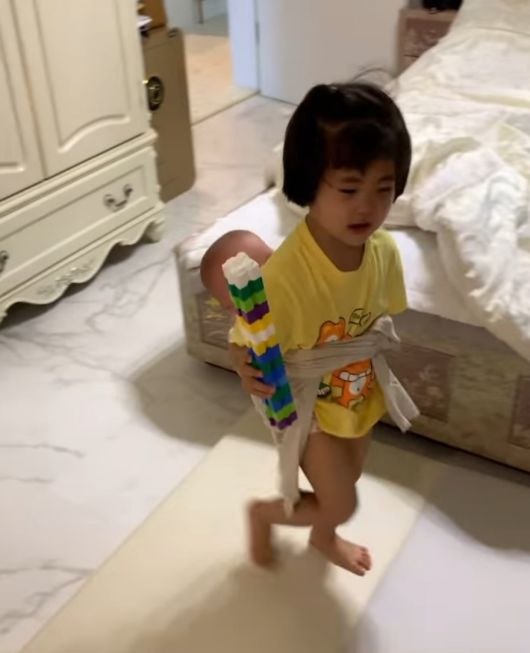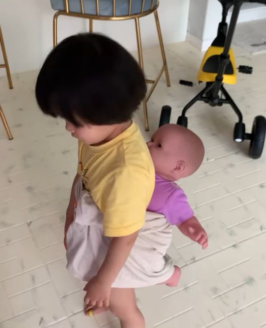 공개된 영상에는 아기 인형을 등에 업고 돌아다니는 딸 혜정 양 모습이 담겼고, 함소원은 "동생 우유는 줬어?"라고 묻는 등 실제 아기처럼 다루고 있다.