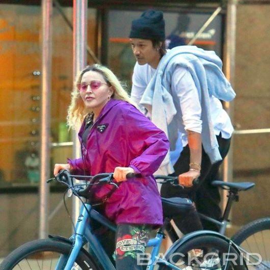 공개된 사진 속 마돈나는 프라다 재킷을 입은 채 자전거를 신나게 타고 있는 모습. 두 사람은 함께 여행을 다니며 2년째 열애 중이다.
