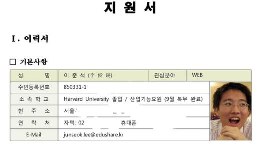 공개된 지원서에는 더벅머리에 안경을 쓴 25살 당시 이 대표의 사진도 담겼다. 장난기 어린 웃음을 머금은 앳된 얼굴은 지금과는 사뭇 다른 모습이다.