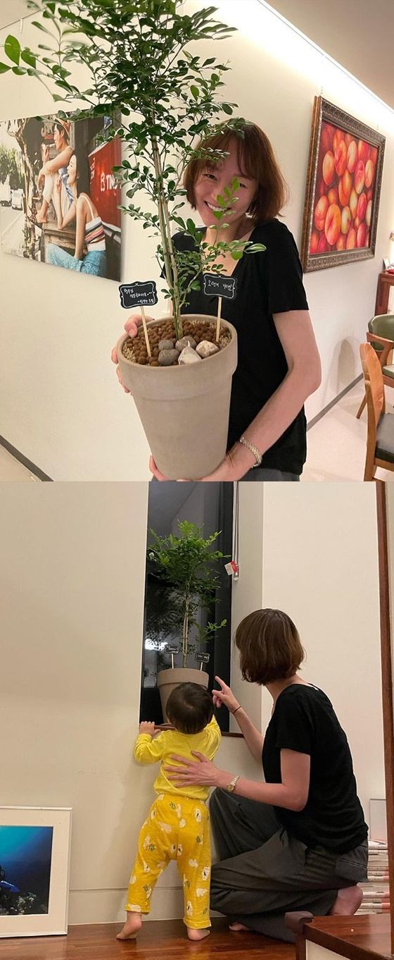 공개된 사진 속 이혜정은 오렌지 쟈스민이 심어진 화분을 들고 포즈를 취하고 있다. 이어진 사진에는 아들과 함께 나무를 돌보고 있는 모습이다.