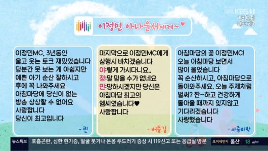 방송 말미, 이정민 아나운서는 자신을 위한 시청자들의 응원 메시지에 눈물을 보였다. 이정민 아나운서는 "제가 생각보다 눈물이 많이 난다. 우리나라 중고등학교가 3년이지 않나. 3년을 학교 다니는 것처럼 스튜디오에서 많이 배우고 성장했다. 그 이유는 옆에 계신 선배님 덕"이라고 인사했다.