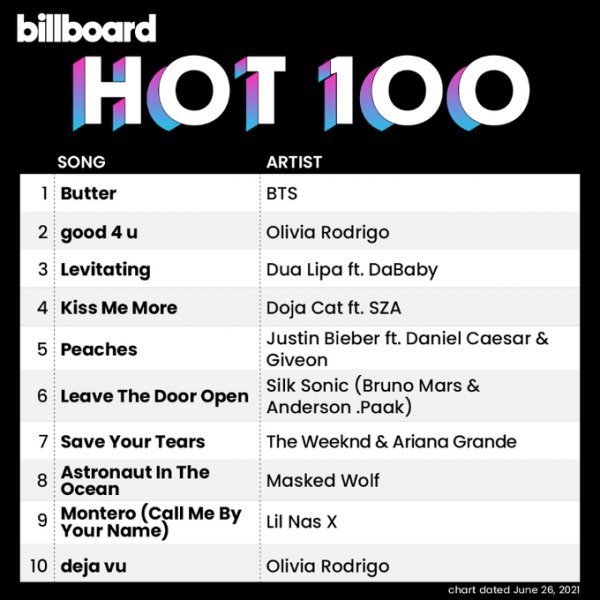 미국 빌보드는 21일(현지시각) 방탄소년단이 지난달 21일 공개한 디지털 싱글 'Butter'로 빌보드 최신 차트(6월 26일 자)에서 '핫 100' 정상에 올랐다고 발표했다.