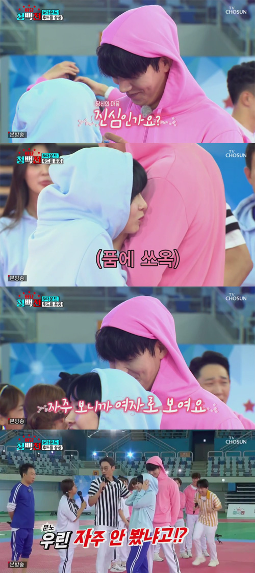이날 MC들은 서로의 후드티 끈을 잇고 상대팀의 옆통수에 있는 단어를 맞히면 승리하는 ‘후드를 꽁꽁’ 게임에 앞서 이대형과 은가은에게 “서로에게 하고 싶었던 질문을 한 가지만 해보라”라고 말했다.