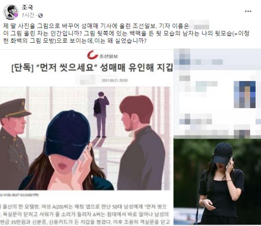 앞서 22일 밤 조 전 장관은 자신의 트위터와 페이스북 등 SNS 계정에 “조선일보가 성매매 범죄 기사에 자신과 자신의 딸 사진을 일러스트로 바꿔썼다”고 알리며 강력히 항의했다.