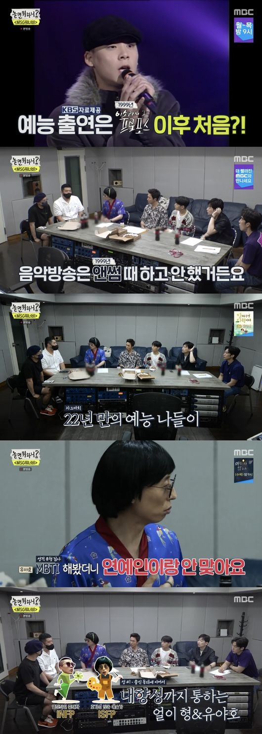 이말에 유재석은 “믿으실지 모르겠지만 MBTI 해봤더니 연예인이랑 안 맞는고 나서는 걸 안 좋아한다”고 말했다. 이어 유재석은 MBTI가 ISFP라며 “연예인은 E가 많다”고 말했고 나얼은 "저는 INFP다"라며 고백했다.