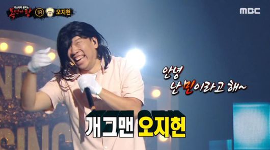 1점 충격 속 가면을 벗은 복면가왕의 정체는 개그맨 오지헌이었다. 오지헌은 개그계의 이병헌, 원빈이라고 자신을 언급했다며 "이병헌, 원빈 씨가 잘생겨서 연기력이 가려지듯 저도 약간 외모 때문에 개그 감각이 가려지는 것 같더라. 저 사실 라디오 DJ 하고 싶다. 눈 감고 들으시면 괜찮다"고 어필했다.