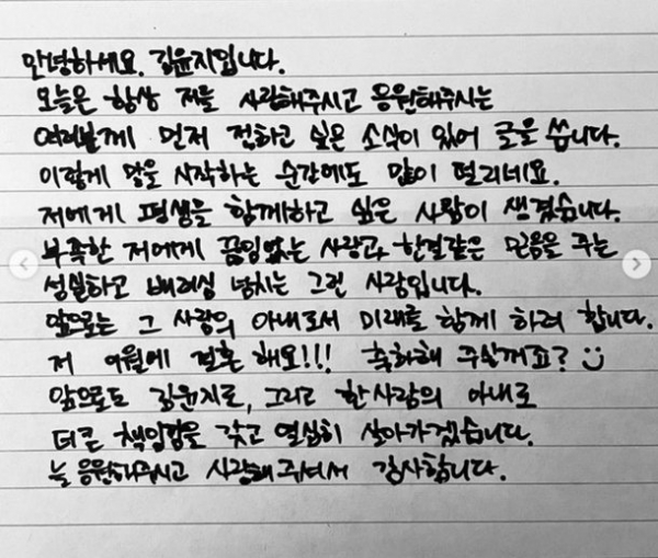 오늘은 항상 저를 사랑해주시고 응원해주시는 여러분께 먼저 전하고 싶은 소식이 있어 글을 씁니다. 이렇게 말을 시작하는 순간에도 많이 떨리네요. 저에게 평생을 함께하고 싶은 사람이 생겼습니다. 부족한 저에게 끊임없는 사랑과 한결같은 믿음을 주는 성실하고 배려심 넘치는 그런 사람입니다. 앞으로는 그사람의 아내로서 미래를 함께하려 합니다. 저 9월에 결혼해요! 축하해 주실꺼죠? 앞으로도 김윤지로, 그리고 한사람의 아내로 더 큰 책임감을 갖고 열심히 살아가겠습니다. 늘 응원해주시고 사랑해주셔서 감사합니다.