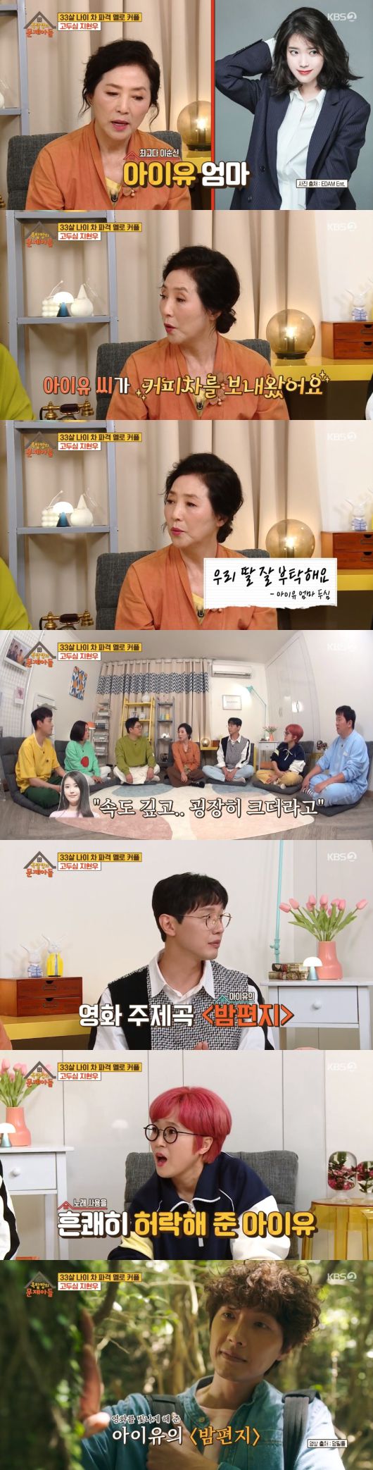 지난 29일 방송된 KBS 2TV 예능 프로그램 '옥탑방의 문제아들'에서는 영화 '빛나는 순간'으로 연기 호흡을 맞춘 배우 고두심, 지현우가 게스트로 출연한 가운데 평소 미담이 많기로 유명한 아이유의 또 다른 미담이 알려졌다.