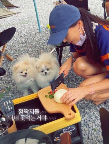 공개된 사진 속에는 고소영이 반려견 두 마리 옆에서 캠핑 요리를 하고 있는 모습이 담겨 있다. 반려견들은 고소영이 요리를 시작하자 곁으로 다가와 호기심을 드러내며 시선을 떼지 못했다. 이에 고소영은 고추와 양파 등을 썰면서 "껌딱지들 너네 못 먹는거야"라는 멘트를 남겼고, 도마에 시선을 집중한 반려견의 표정이 귀여움을 배가시켰다.