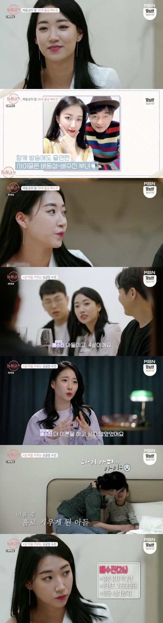 18일 방송된 MBN '돌싱글즈'는 출연 남녀들이 자신을 소개하는 모습이 담겼다. 배수진은 "26살이다. 콘텐츠 크리에이터"라고 소개했다. 이어 "여기 나오기 전에 이혼 소식이 다 알려졌다. 전 남편이랑 공개적으로 TV에도 나온 적 있다"며 "아빠가 배동성이다. 아들이 있다. 네 살이다"고 말했다.