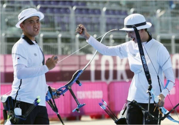 [스타인뉴스 김학철 기자] 한국 양궁의 '무서운 막내들' 김제덕(17·경북일고)과 안산(20·광주여대)이 올림픽 데뷔 무대에서 금메달을 합작했다.