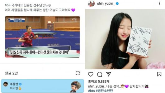 신유빈은 그간 방탄소년단의 팬임을 알려온 바. 더불어 지난달 15일에는 자신의 인스타그램에 방탄소년단의 사인 CD를 들고 "나는 성덕, 감사합니다"라는 글을 올리며 더욱 주목 받았다.