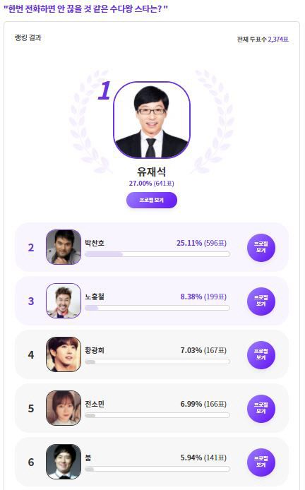 지난 18일부터 24일까지 총 7일간 커뮤니티 포털사이트 디시인사이드와 취향 검색 기업 마이셀럽스가 운영 중인 ‘익사이팅디시’가 진행한 ‘한 번 전화하면 안 끊을 것 같은 수다왕 스타는?’으로 투표한 결과 유재석이 1위로 선정됐다.
