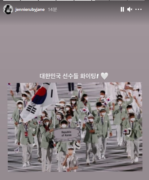 [스타인뉴스 최나혜 인턴기자] 제니가 대한민국 국가대표 선수들을 응원했다. 2021년 7월 29일, 제니는 자신의 인스타그램 스토리에 도쿄올림픽 개회식에 입장하는 국가대표들의 사진을 업로드하며 ‘대한민국 선수들 파이팅!’이라는 문구를 덧붙였다.