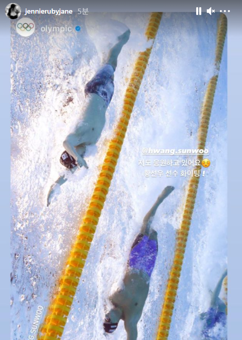 앞서, 황선우 선수는 좋아하는 아이돌을 묻자 블랙핑크 제니와 있지 예지를 좋아한다고 답한 바 있다. 제니는 이와 같은 소식을 듣고, 황선우 선수 응원에 나선 것이다.
