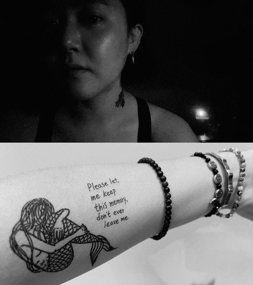 또 다른 사진에도 문근영의 팔에 새긴 인어와 레터링이 담겨 있다. '이 기억을 간직하게 해줘. 날 떠나지마'라는 의미의 문구가 그의 심경을 대변하는 듯해 궁금증을 유발한다.