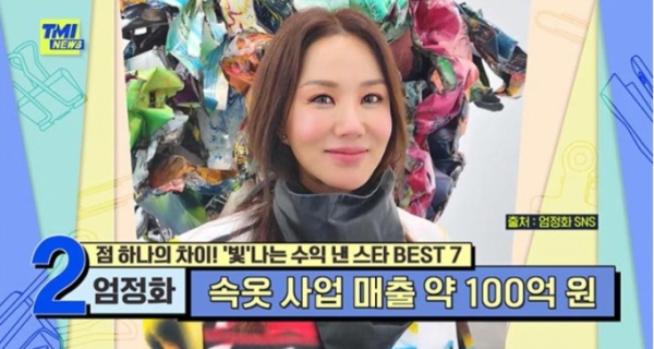 지난 28일 방송된 Mnet 예능 ‘TMI 뉴스’에서는 '빛나는 수익을 많이 낸 스타'와 '손해를 많이 본 스타'의 명단이 공개됐다. 수익을 많이 낸 스타 2위에 엄정화가 이름을 올렸다.
