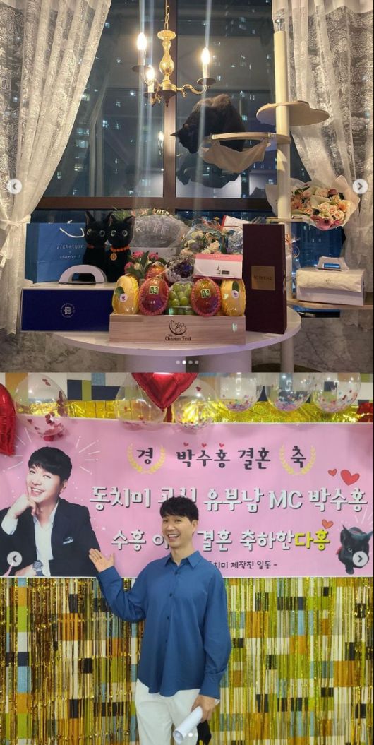 공개된 사진 속에는 주변으로부터 받은 결혼 축하 선물 인증샷이 담겼다. 고양이 다홍이를 본 따 만든 인형부터 과일, 케이크, 꽃다발 등 박수홍 부부를 위한 선물이 가득했다. 특히 케이크 안에는 박수홍과 함께 예비신부의 얼굴이 그려져 눈길을 모았다.
