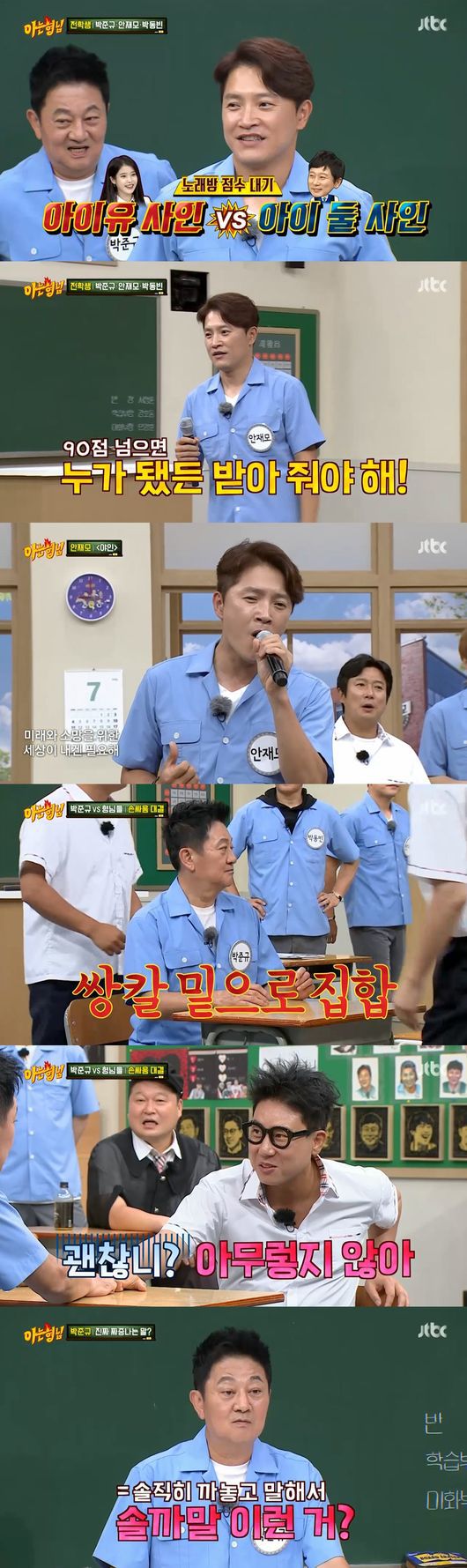 안재모는 "딸이 아이유를 정말 좋아한다. 희철이가 친하니까 부탁을 할 수 있을 것 같다"라며 노래방 점수 내기를 제안했다. 이에 김희철은 "90점 밑으로 나오면 아이 둘 아빠 싸인을 주겠다"라고 말해 웃음을 자아냈다. 이날 안재모는 드라마 '야인시대'의 OST인 '야인'을 열창했고 96점을 받아 성공했다.