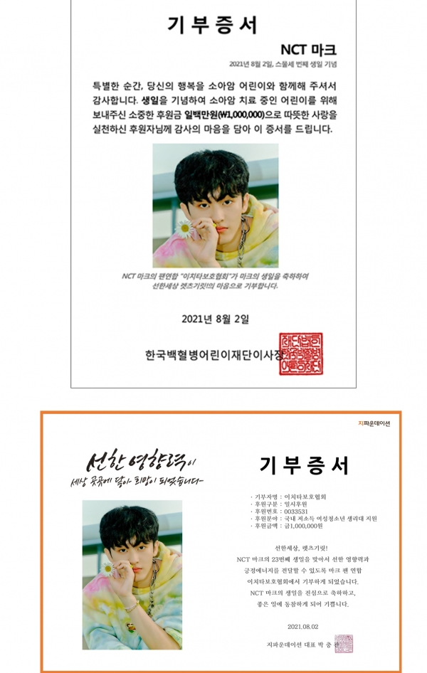 한국백혈병어린이재단과 지파운데이션은 NCT 마크의 생일인 8월 2일에 맞춰 NCT 마크의 이름으로 기부증서를 발급했다.