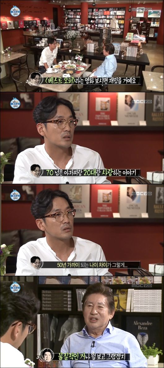 김용건이 "아버지 이야기 같냐"고 물었고, 하정우는 "그렇진 않은데 50년 가까이 되는 나이 차이가 그렇게 쑥스럽지 않더라. 근데 그 20대 여자가 사기를 치는 거로 끝나긴 한다. 반전이 있기 전까지는 아름다워 보였다. 그런데 사기를 치더라"라고 답했다.