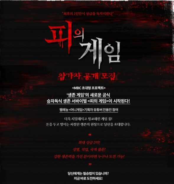 이에 MBC는 참가자 공개모집을 진행한다. 만 19세 이상 성인 남녀 누구나 지원할 수 있으며, 모집기간은 2021년 8월 5일 (목)부터 8월 15일 (일)까지다. 지원방법은 ‘피의 게임’ 공식 홈페이지(지원자 모집 | 피의 게임 | GO! MBC (imbc.com))를 통해 확인할 수 있다.